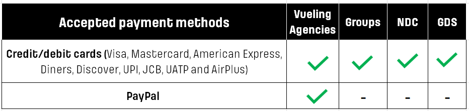 To strengthen our relationship with travel agencies, Vueling has adapted its payment policy and accepts all payment methods, including agency corporate cards, provided that the total transaction cost (fees or other charges associated with the payment method) does not exceed 1%.