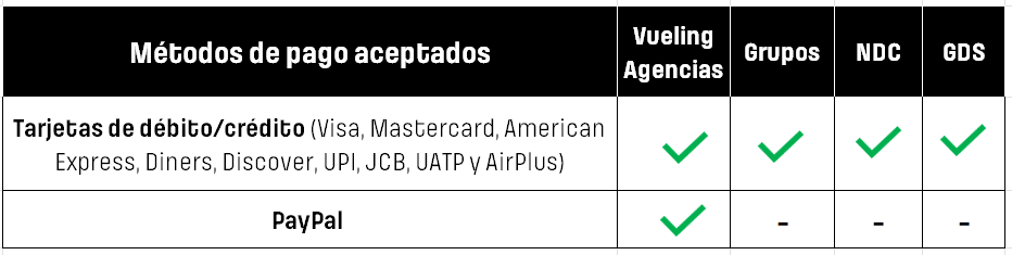 Reafirmando la relación con nuestras agencias colaboradoras, Vueling adapta su política de pagos y acepta todos los métodos de pago, incluidas las tarjetas corporativas de agencias, siempre que el coste total por transacción (comisiones u otros cargos asociados al método de pago) no supere el 1%.