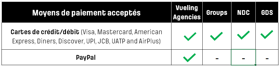 Afin de renforcer notre relation avec les agences de voyages, Vueling a adapté sa politique de paiement et accepte tous les moyens de paiement, y compris les cartes corporate, à condition que le coût total de la transaction (frais ou autres charges liés au mode de paiement) ne dépasse pas 1 %.