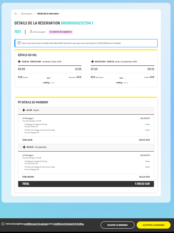 - Depuis l'acceptation du devis et jusqu'à 72h avant le départ du premier vol de la réservation, vous pouvez les gérer depuis le portail de Groupes.