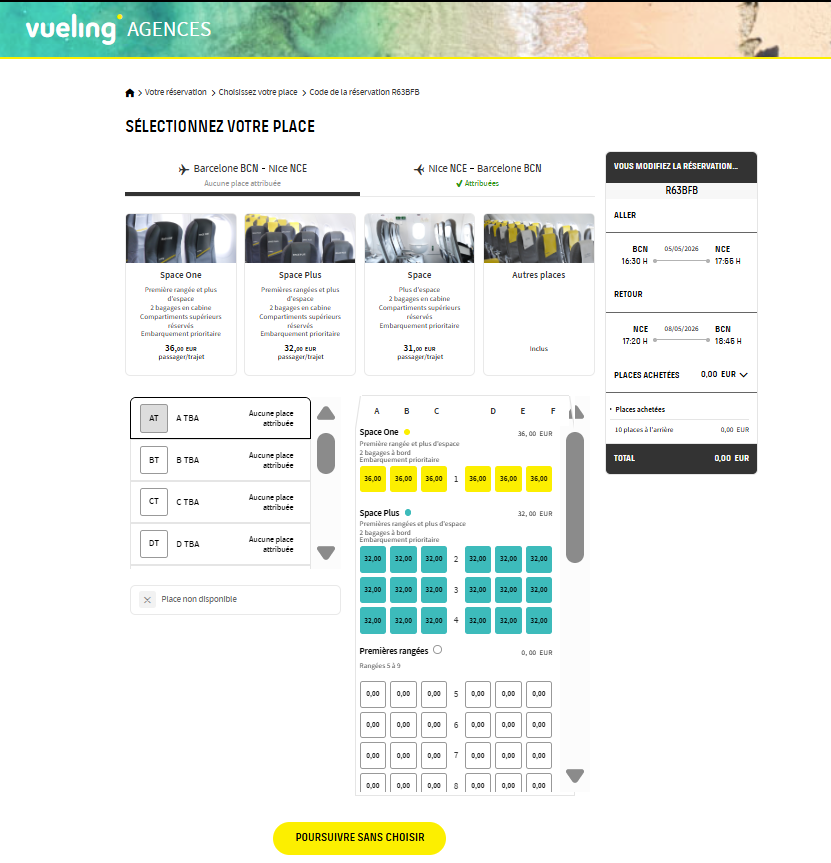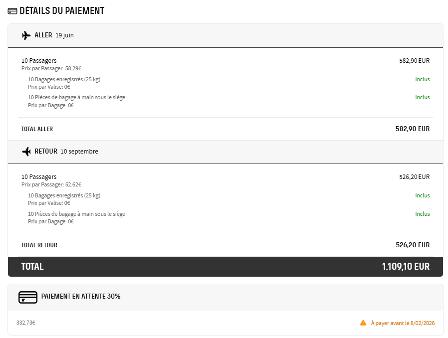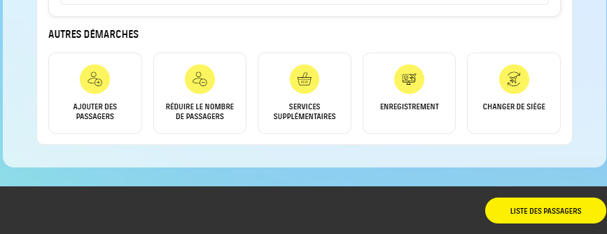 - La possibilité d'ajouter des services supplémentaires, de changer de sièges et de faire le check-in en ligne ne sera disponible qu'une fois le paiement final effectué et le PNR créé.