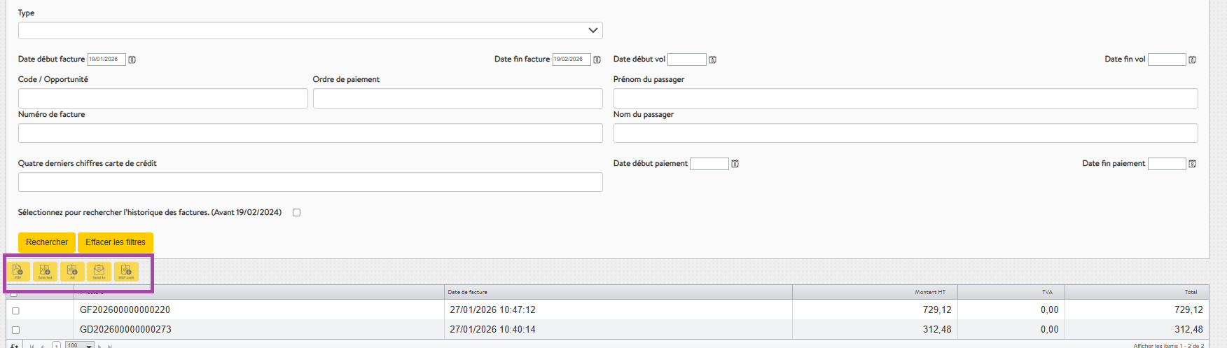 Une fois dans la section, vous pouvez utiliser le filtre avec les critères de recherche pour voir et télécharger les factures.