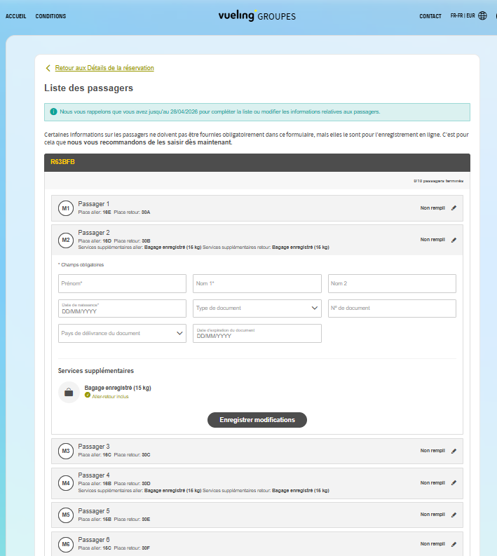 - Il est nécessaire d'ajouter toutes les données demandées pour traiter le check-in en ligne du groupe et obtenir les cartes d'embarquement.